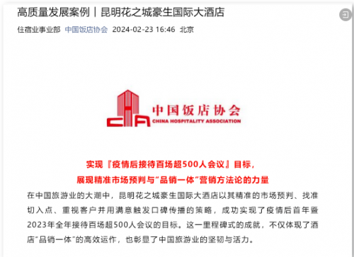 近日,昆明花之城豪生国际大酒店作为“高质量发展案例”登上中国饭店协会官方公众号,成为2024年云南省首家获中国饭店协会官方推荐的首家高质量发展案例酒店,酒店通过实施“品销一体”战略,在激烈的市场竞争中实现了高质量发展。