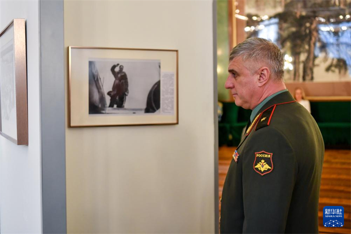 4月18日,在俄罗斯首都莫斯科,嘉宾参观纪念中国人民抗日战争暨世界反法西斯战争胜利80周年图片展。新华社记者 曹阳 摄