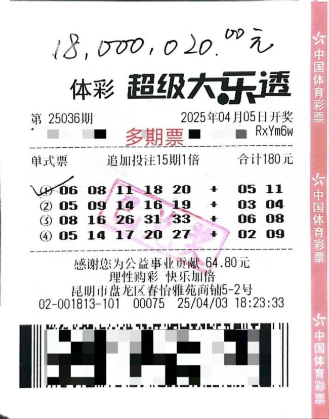 90后夫妻中1800万 爱情数字密码见证奇迹!4月20日,云南体彩微信公众号发布消息,昆明一位购彩者喜中1注一等奖,奖金高达1800万元。次日,大乐透第25042期一等奖得主现身领奖大厅。这位幸运儿是一对90后夫妻中的丈夫小刘哥(化姓)。