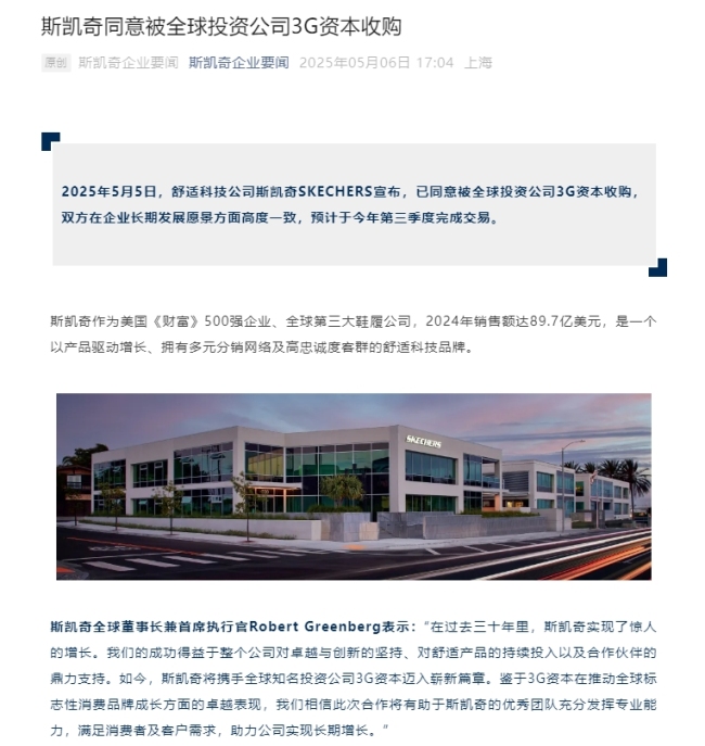 斯凯奇方面称,双方在企业长期发展愿景方面高度一致,预计于今年第三季度完成交易。