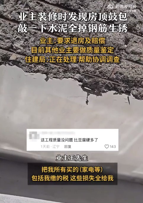 5月10日,黑龙江七台河,网曝滨尚雅居二期业主装修发现房顶鼓包,捅一下周围水泥大面积掉落,钢筋已经生锈。对此,业主王先生回应称,当地住建部门表示已达到退房标准。自己提出要求退房以及赔偿,目前其他业主要求开发公司做质量鉴定。当地住建局工作人员回应,正在处理此事,也在帮助协调调查。