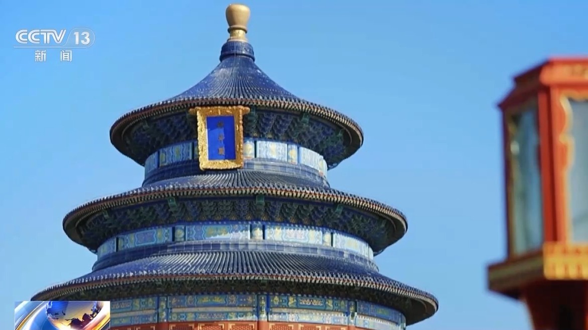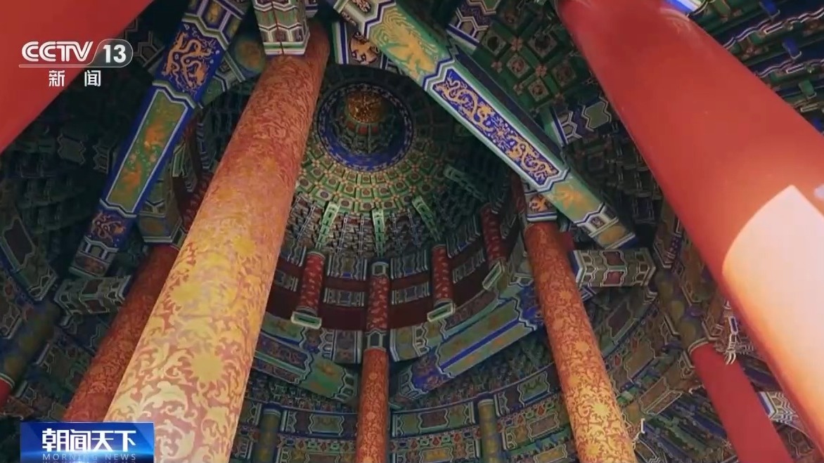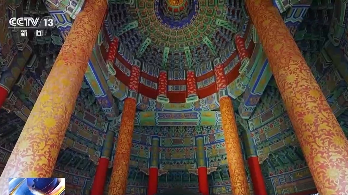天坛公园工作人员 张华伟:在祈年殿上面,房檐是弯曲的,运用到了最速曲线。一般说两点之间直线最短,但是如果房檐设计成直的,下雨或者下雪的时候,雨水不会以最快速度从房檐上排出去。按现在这种角度,雨水会以最快的速度从房顶上甩出去,保证木结构的建筑不会长期被水泡着,防止腐蚀。