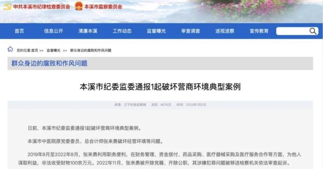 本溪市纪委监委曾于2023年1月5日发布了一起破坏营商环境的典型案例,该案例直指本溪市中医院原党委委员、总会计师张来勇,案例指出2019年8月至2022年8月期间,张来勇利用职务便利,在财务管理、资金拨付、药品采购、医疗器械采购及医疗服务合作等方面,为他人谋取利益,非法收受财务100万元。
