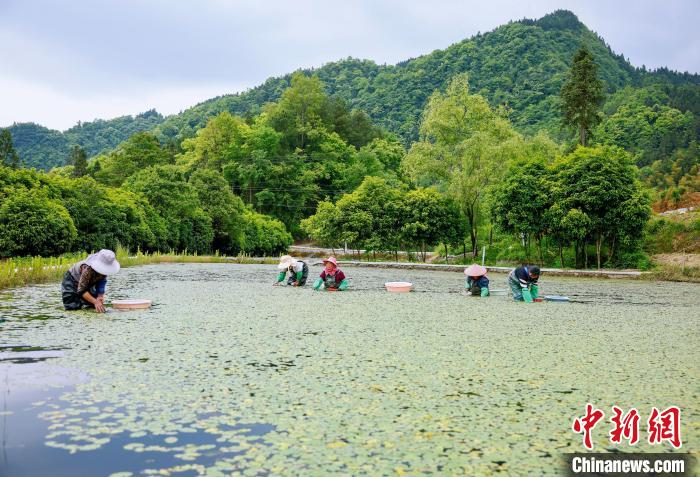 近日,在湖北省恩施土家族苗族自治州咸丰县黄金洞乡五谷坪村的高山莼菜基地,身穿防水裤的村民们忙着采摘莼菜。莼菜被誉为“水中人参”,天生娇贵,对水质、土壤等生态环境要求非常高。近年来,咸丰县利用独特的生态环境,因地制宜发展莼菜、白茶等特色产业110万亩,助农增收致富,助力乡村振兴。廖祖英 摄