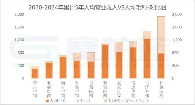 从2020-2024年综合累计5年人均营业收入来看,和黄医药、百济神州、信达生物排前三。