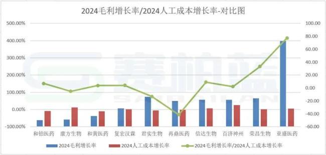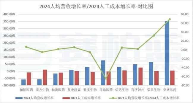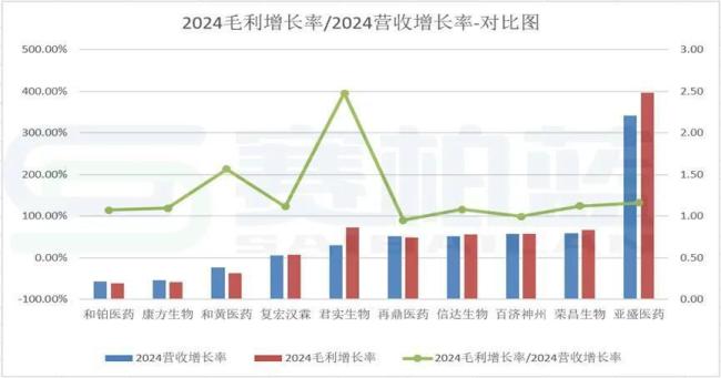 从此图表中可以看出,亚盛医药2024的毛利率增长/人工成本增长率比值77.35为最高,其主要原因在于亚盛医药实现收入人民币9.81亿元,较去年同比大幅增长342%。