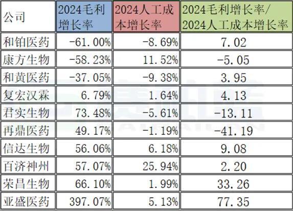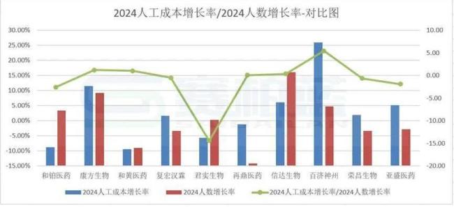 从此图表中可以看出,君实生物2024人工成本增长率/人数增长率比值是-14.4,2024人工成本增长率是-5.61%,人数增长率是0.39%,也就是说人数增长了一点点,但人工成本下降幅度大。