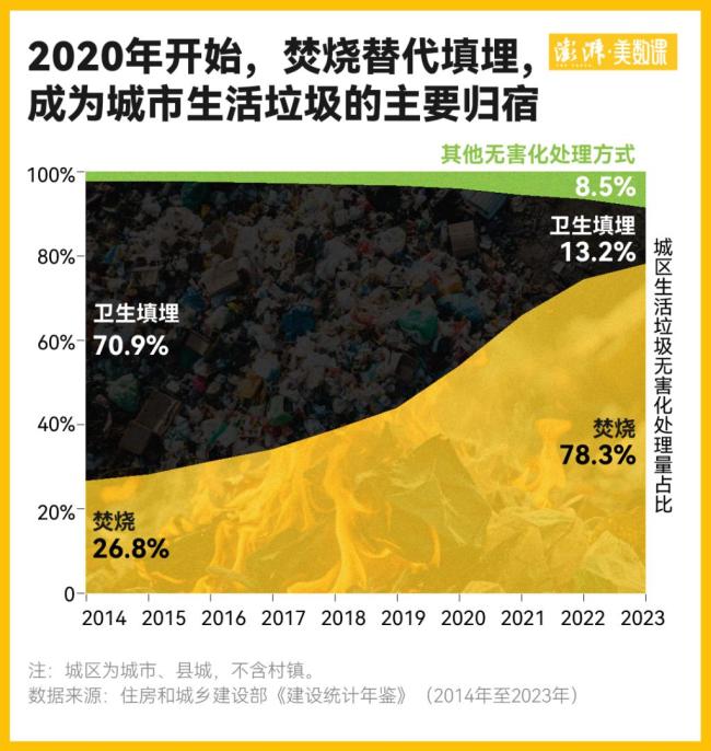 现在许多城市已不再需要生活垃圾填埋场,垃圾去哪了?答案是烧掉了。在西安灞桥江村沟垃圾填埋场封场的同一年,焚烧反超卫生填埋,成为国内城区生活垃圾的第一大处理方式。到2023年,城区的生活垃圾中有78.3%都是焚烧处理掉的,卫生填埋量占比已下降到了13.2%。