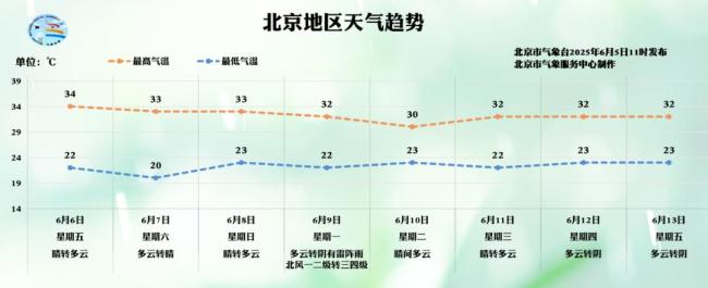 6日白天(周五)晴转多云,北转南风二三级,平原地区最高气温34℃,山区最高气温31至34℃。夜间多云间晴,南风一级转北风三级左右,平原地区最低气温22℃,山区最低气温17至21℃。