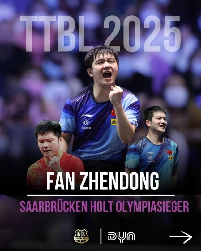 6月1日,德甲萨尔布吕肯俱乐部宣布樊振东加盟,征战2025-2026赛季德国乒乓球甲级联赛和欧洲冠军联赛。樊振东表示:“我真的很期待在萨尔布吕肯和德甲的新挑战,体验新的环境——并与球队一起赢得更多的胜利。”