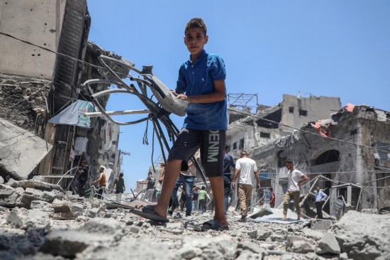 5月31日,在加沙城,一名青年在以军袭击后的废墟中搜寻物品。新华社发(里泽克·阿卜杜勒贾瓦德摄)