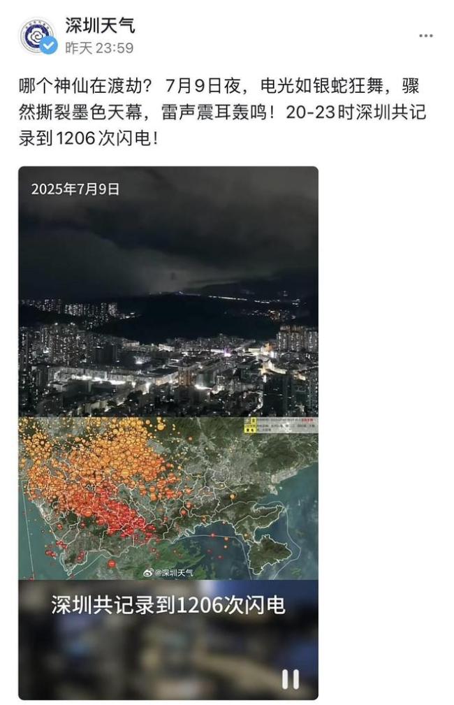 据深圳市国家气候观象台官方号“深圳气象”描述,当晚电光如银蛇狂舞,骤然撕裂墨色天幕,雷声震耳轰鸣,从20时至23时共记录到1206次闪电。