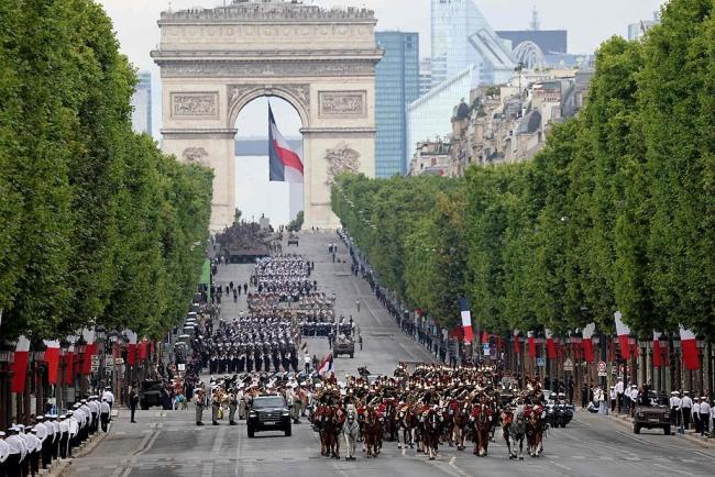 当天9时55分,马克龙从弗里德兰大道乘车抵达戴高乐广场,随后开始检阅部队。空中、机动及骑兵方阵依次展示。10时25分,空军飞行表演正式开始,持续约9分钟,共有65架飞机参与编队飞行,其中包括来自德国、英国、意大利和瑞士等国的几架飞机。