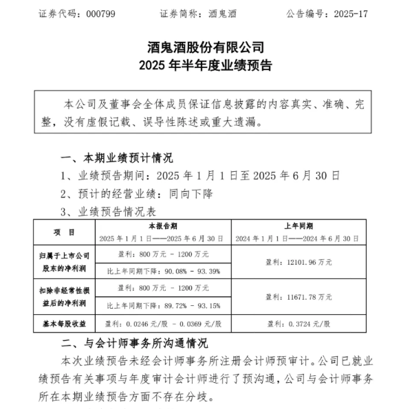 业绩预告显示,2025 年上半年,酒鬼酒营收预计仅 5.6 亿元,同比减少 4.1 亿元,降幅达 43%;净利润仅剩 800 万 - 1200 万元,同比减少 8600 万 - 9000 万元,降幅高达 93%。这意味着公司上半年日均净利润不足 7 万元,甚至不及部分头部酒企单日利润零头。