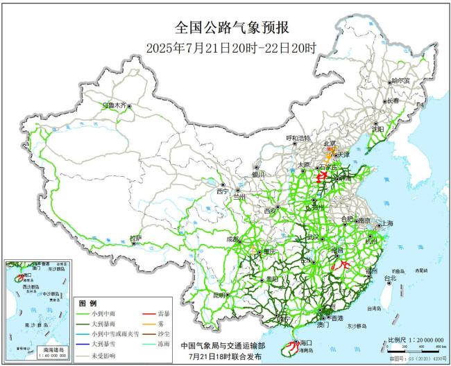 7月21日20时至22日20时,福建东部和南部、广东中东部和南部、海南岛西部和南部、广西大部、云南东南部以及贵州大部、四川盆地南部、重庆南部、湖北西部、湖南中西部、江西西部和南部、浙江东南部、河南中部、山东北部、辽宁东南部等地的部分地区有大到暴雨,其中广东南部沿海、广西南部、福建东部沿海、山东东北部等地的局部地区有大暴雨。上述部分地区伴有短时强降水,局地有雷暴大风等强对流天气。另外,天津北部、河北中部、重庆西南部等地局地有雾。