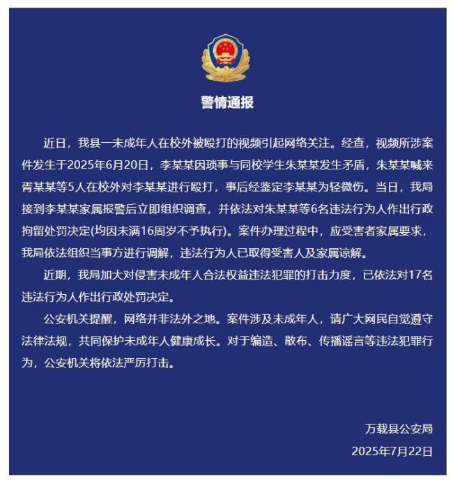 7月22日,江西万载县公安局发布警情通报,称近日一段未成年人在校外被殴打的视频在网络上引起关注。经调查,该事件发生在2025年6月20日,李某某因琐事与同校学生朱某某发生矛盾,随后朱某某找来胥某某等五人在校外对李某某进行了殴打。事后,李某某被鉴定为轻微伤。警方接到李某某家属报警后立即展开调查,并依法对朱某某等六名违法行为人作出行政拘留处罚决定,但由于他们均未满16周岁,不予执行。案件办理过程中,应受害者家属要求,警方组织了当事方进行调解,违法行为人已取得受害人及家属谅解。