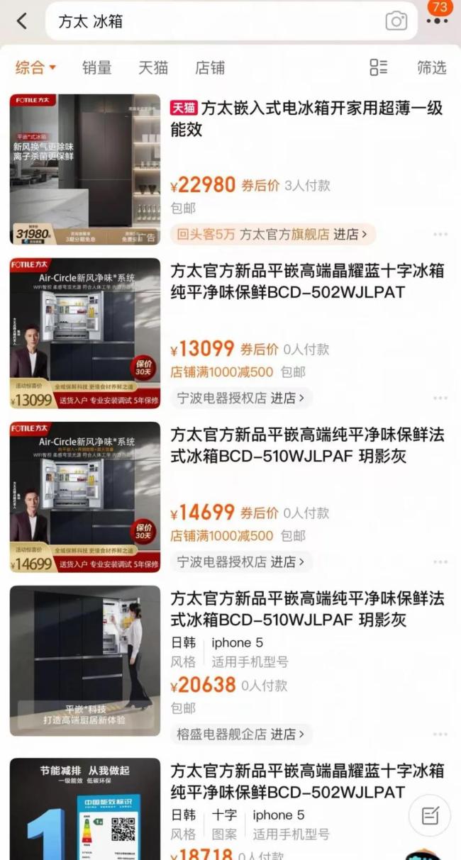 再用多少华丽之词也无法改变销量上的“骨感”。在淘宝搜索方太冰箱,可以看到方太官方旗舰店的冰箱有“新全嵌”和“基础款”,价格最高的39980元,最低的也要22980元,目前只售出3台。并且除了官方旗舰店,其他渠道销售这款冰箱也非常少,销量也几乎为零。在京东平台上,方太冰箱售出4台。