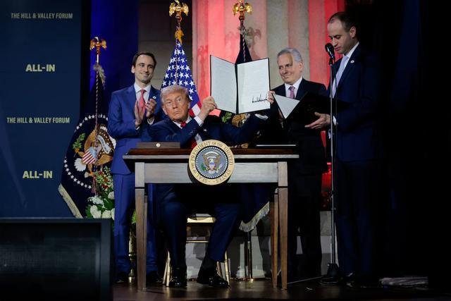 特朗普在华盛顿特区的一场人工智能活动上展示了已签署的行政命令。该活动由科技领袖创立的利益集团“山与谷论坛”和播客“All-In”联合主办。特朗普表示:“美国必须再次成为一个为创新者亮绿灯、给予奖励,而非被官僚主义束缚的国家。”他提到旨在打击过度监管的行政命令时,得到了科技界领袖们的热烈响应。