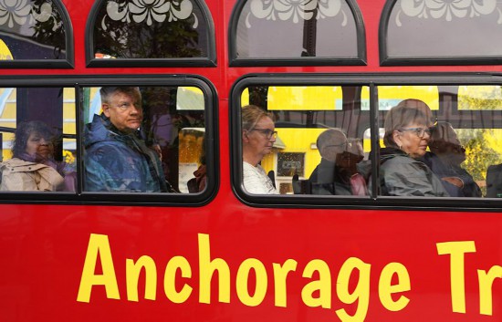 8月14日,人们乘坐观光车在美国阿拉斯加州安克雷奇游览。俄罗斯总统普京和美国总统特朗普定于15日在安克雷奇举行一对一会晤。新华社记者吴晓凌摄