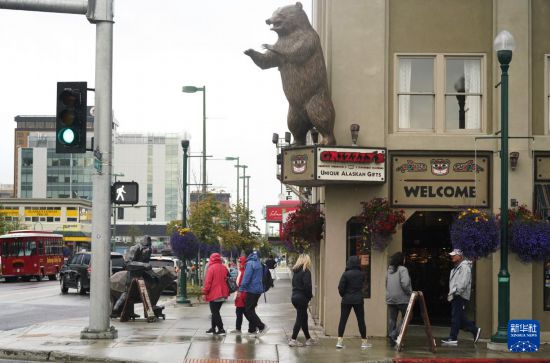 8月14日,行人从美国阿拉斯加州安克雷奇市中心街头走过。新华社记者吴晓凌摄