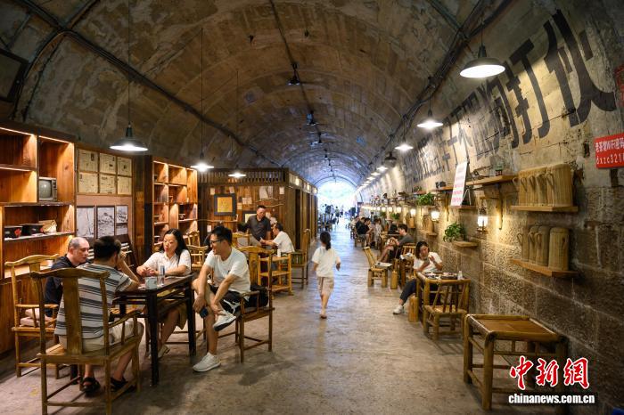 图为8月16日,市民在重庆渝北区一防空洞改造的茶馆内喝茶、休闲。中新社记者 何蓬磊 摄