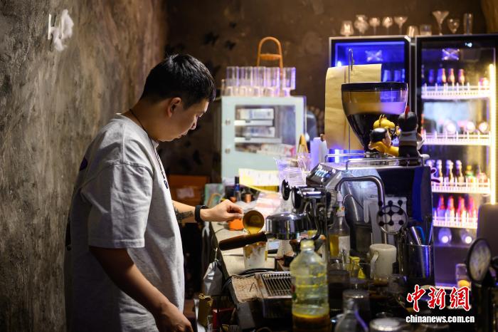 图为8月18日,重庆渝中区一防空洞咖啡店主理人在为顾客制作咖啡。中新社记者 何蓬磊 摄
