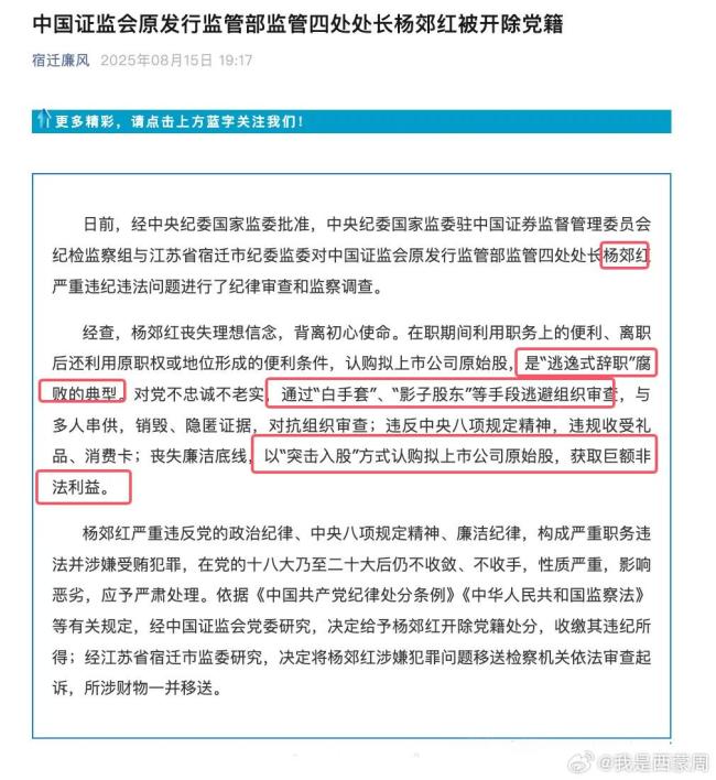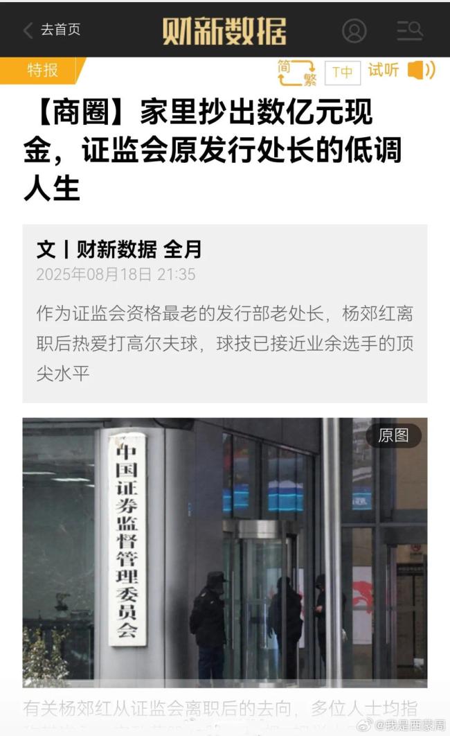 证监会原处长杨郊红被查家中抄出2至3亿元现金。记得电视剧《人民的名义》有一集说到,国家某部委某处长赵德汉(侯勇饰演)家中私藏现金2.3亿现金:床下摆满百元大钞,墙里叠满百元大钞,冰箱里塞满百元大钞,视觉震撼难以形容(注:这一剧情是取材于真实案例,赵德汉的原型就是“亿元司长”魏鹏远。魏鹏远,国家能源局煤炭司原副司长。由于国家能源局级别为副部,这名“副司长”其实是一名正处级官员)!没想到,现实中再次重演这一幕,《财新》报道:中国证监会原发行监管部监管四处处长杨郊红,因涉嫌严重违纪违法被查,家里还被抄出2至3亿元现金。