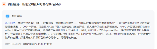 近日,有投资者在互动平台向浙江自然提问,内容涉及其在AI方向的布局。浙江自然回复称,今年,公司产品研发部门在Rhino平台上自主开发了3D模拟插件,将传统二维设计升级为三维设计。同时引入了Octopus AI平台,通过智能算法进行力学分析,显著提升了产品设计效率和质量。