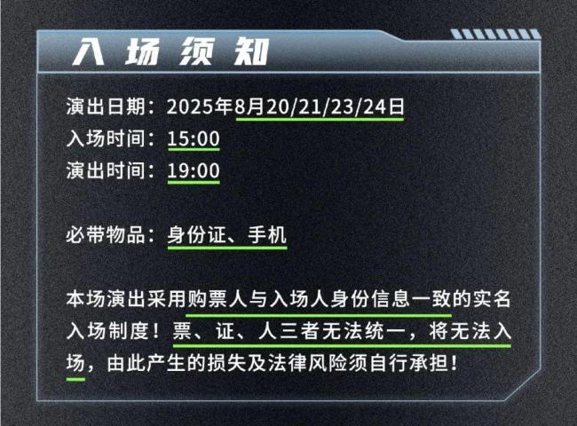 禁带物品包括LED灯牌、旗帜、三脚支架、自拍杆、激光笔、投影设施、喷涂颜料及大件行李(现场无寄存)。本次演出将对票务信息不符及携带禁带物品的行为采取严格处理措施,安检力度也将全面加强,任何违规行为都可能导致无法入场。