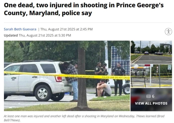 据报道,枪击发生在乔治王子县一处购物中心附近,一名青少年和一名成年男子中枪。中枪青少年已被送医救治,另有一名成年男子中枪,后被当场宣告死亡。