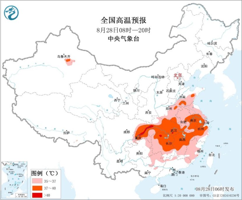 预计8月28日白天,新疆吐鲁番盆地、山东中南部、河南东部和南部、安徽、江苏、上海、湖北、湖南、江西、浙江大部、福建大部、四川盆地东部、重庆、贵州东部、广西东北部、广东北部等地有35℃以上高温天气,其中,山东中南部、河南东部和南部、苏皖南部、湖北大部、湖南中北部、江西中北部、浙江北部、四川盆地东北部、重庆中北部等地部分地区最高气温37~39℃,重庆中北部、湖南西北部等地局地可达40℃以上。中央气象台8月28日06时继续发布高温黄色预警。