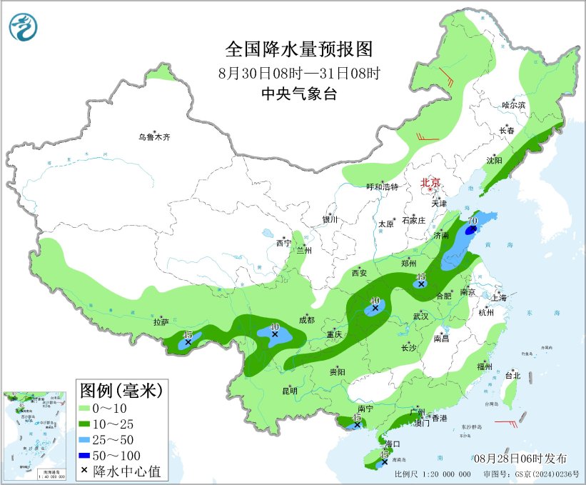 全国降水量预报图(8月29日08时-30日08时)