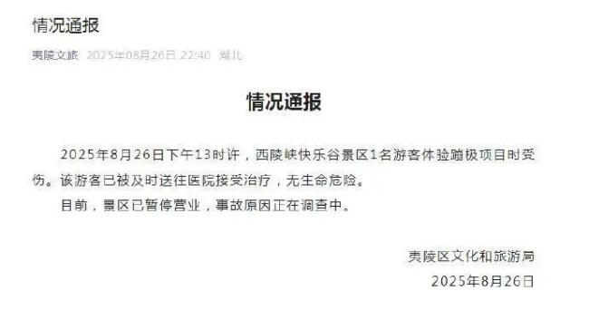 8月26日下午1点左右,西陵峡快乐谷景区一名游客在体验蹦极项目时受伤。该游客已被及时送往医院接受治疗,无生命危险。目前,景区已暂停营业,事故原因正在调查中。