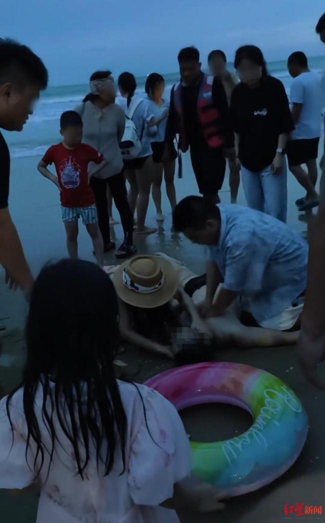 参与救援的刘山宝介绍,事发于8月26日傍晚6点多,地点在三亚海虹广场附近的沙滩。当时,溺水者的妻子发现丈夫不见踪影,便请快艇工作人员在海上搜寻,随后众人将溺水者从海中打捞上岸,立即在沙滩上对其展开急救。刘山宝说,他到达现场时,医务人员已经在给溺水者做心肺复苏。他在医生指导下,给溺水男子做了十多组心肺复苏。抢救期间,溺水者的妻子在一旁情绪崩溃大哭。急救一直持续到晚上8点多,海水开始涨潮,众人将溺水者抬到无积水处,此时对方仍无生命体征,随后大家将其抬上救护车送往医院。