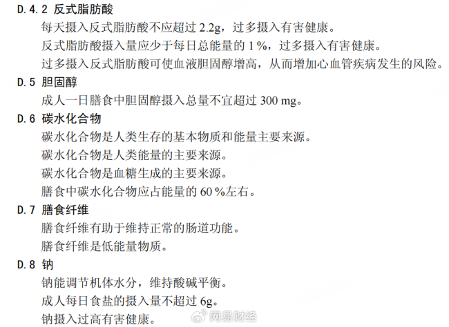 此外,在上述《食品安全国家标准—预包装食品营养标签通则》(GB 28050-2011)中,在“D.4.2反式脂肪酸”一栏中还明确了反式脂肪酸对于人体的危害:“每天摄入反式脂肪酸不应超过2.2g,过多摄入有害健康。反式脂肪酸摄入量应少于每日总能量的1 %,过多摄入有害健康。过多摄入反式脂肪酸可使血液胆固醇增高,从而增加心血管疾病发生的风险”。上述国标中提及的反式脂肪酸包含了天然和工业加工各自产生的反式脂肪酸。