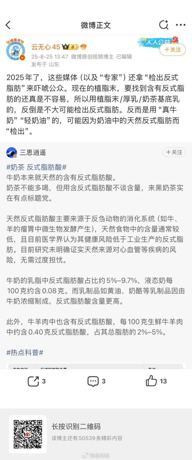 据悉,在此次喜茶发给部分媒体的声明稿件中,有一段食品工程博士、科普作家云无心的观点,该观点指出:如今用植脂末等原料的奶茶反倒是不大可能检出反式脂肪酸,反而是用真牛奶、轻奶油的茶饮产品因为乳品中有天然反式脂肪酸而“被检出”。