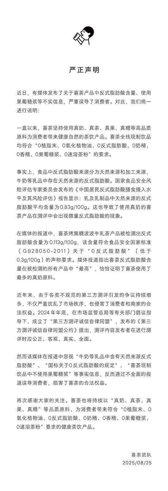 在上述“严正声明”中,喜茶方面引用国家食品安全风险评估专家委员会发布的《中国居民反式脂肪酸膳食摄入水平及其风险评估》报告指出,“乳及乳制品中天然来源的反式脂肪酸平均含量为0.83g/100g。这也导致了使用真奶的喜茶产品在测评中会出现微量反式脂肪酸的现象”。