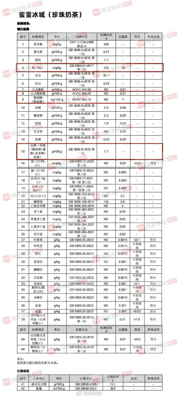此次网易财经送检的奶茶品牌和产品分别为喜茶(烤黑糖波波牛乳茶)、奈雪(金色山脉珍珠奶茶)、蜜雪冰城(珍珠奶茶)、茉莉奶白(栀子奶白)、霸王茶姬(伯牙绝弦)、爷爷不泡茶(空山栀子)、沪上阿姨(浅浅清茉莉针王清乳茶)、茶百道(招牌芋圆奶茶)。