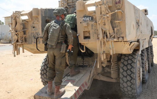 这是8月28日从加沙边境以色列一侧拍摄的以军装甲车和士兵。新华社发(吉尔·科恩·马根摄)