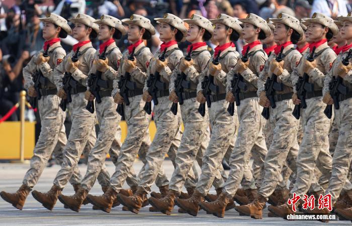 9月3日,纪念中国人民抗日战争暨世界反法西斯战争胜利80周年大会在北京隆重举行。图为民兵方队接受检阅。该方队全部由女民兵组成,这是民兵首次亮相以纪念抗战胜利为主题的阅兵活动。中新网记者 赵文宇 摄