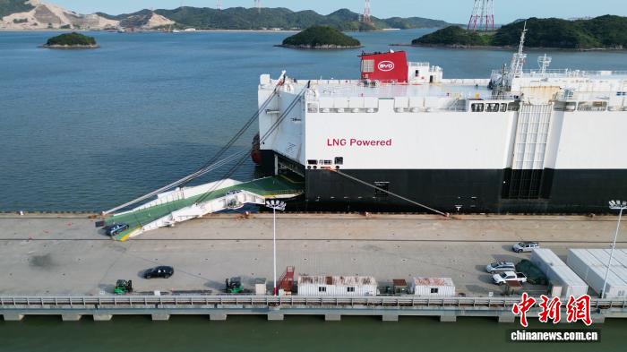 图为新能源汽车有序开上“比亚迪开拓者1号”轮,准备出口海外。(无人机拍摄)雷秉融 摄