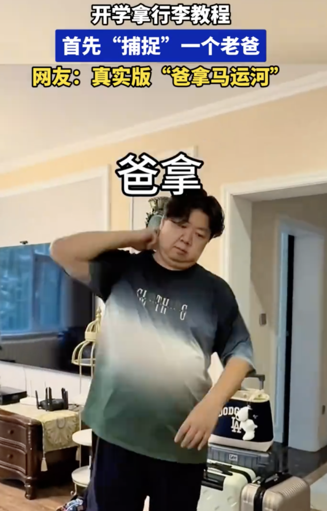 开学季著名景点:“爸拿马运河”。9月开学季,有网友分享自己的开学拿行李教程,首先“捕捉”一个老爸,网友调侃称:“爸拿马运河”。
