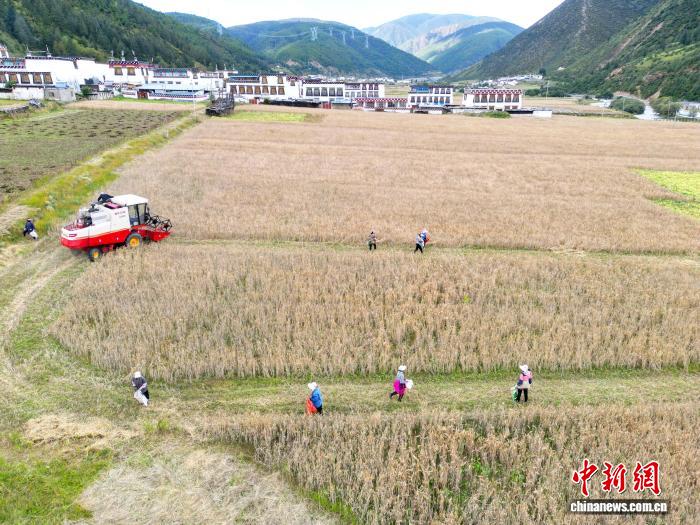 9月14日,四川省甘孜州乡城县热打坝机器轰鸣,村民忙着收割青稞。9月中旬开始,乡城县各地的青稞陆续迎来丰收时节。(无人机照片)中新社记者 张浪 摄