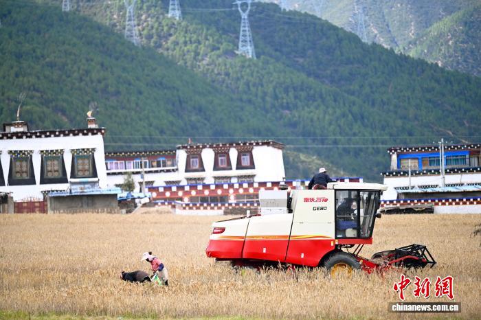 9月14日,四川省甘孜州乡城县热打坝机器轰鸣,村民忙着收割青稞。9月中旬开始,乡城县各地的青稞陆续迎来丰收时节。中新社记者 张浪 摄