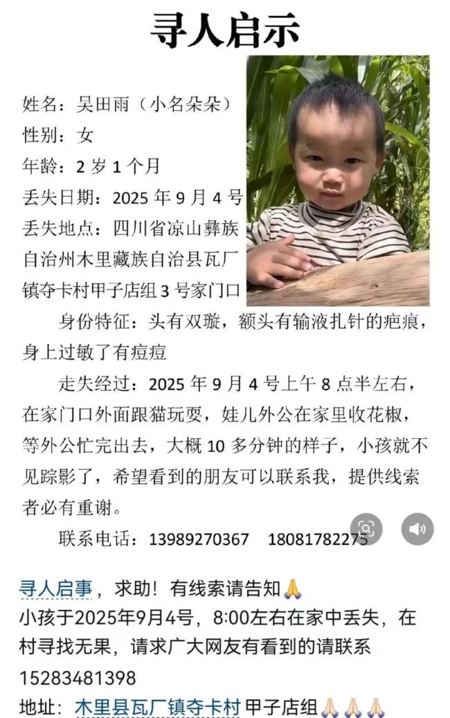 小女孩名叫吴田雨(小名朵朵),年龄2岁1个月。9月4日上午8点半左右,在凉山木里县瓦厂镇夺卡村甲子店组3号家门口走失。当时,朵朵在家门口与猫玩耍,外公在忙完后发现她不见了。家人希望看到的朋友能提供线索,并表示会重谢。