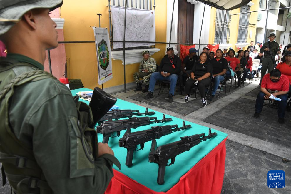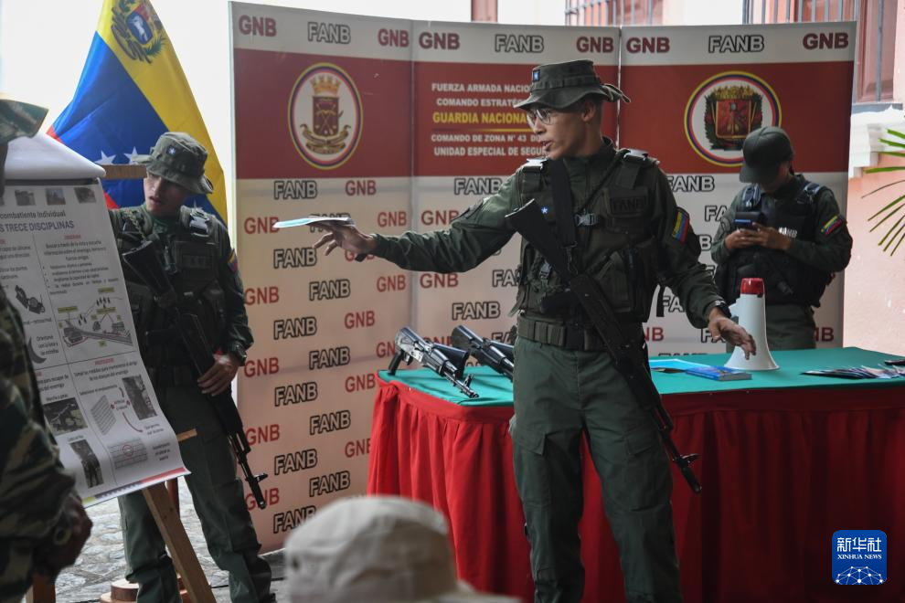 9月20日,在委内瑞拉首都加拉加斯,武装部队人员指导一名参训者使用枪支。新华社发(马科斯·萨尔加多摄)