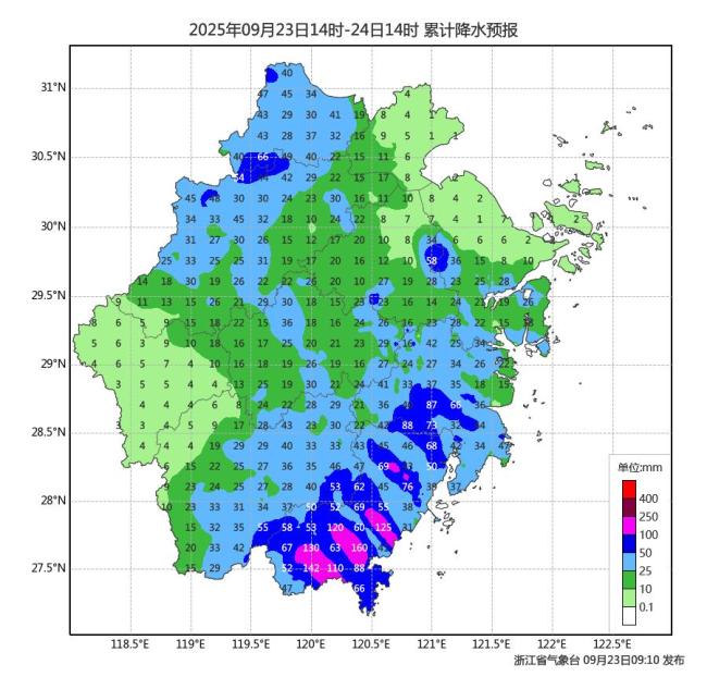台风“桦加沙”虽直冲华南,但其强大的环流仍主宰了浙江的天气。9月23日,温州、台州、宁波南部和丽水东部等地出现大雨暴雨,路桥、平阳、文成、瑞安、青田等地一度发布暴雨红色预警。浙江南部沿海海面和内陆高山区出现了8到10级的阵风。