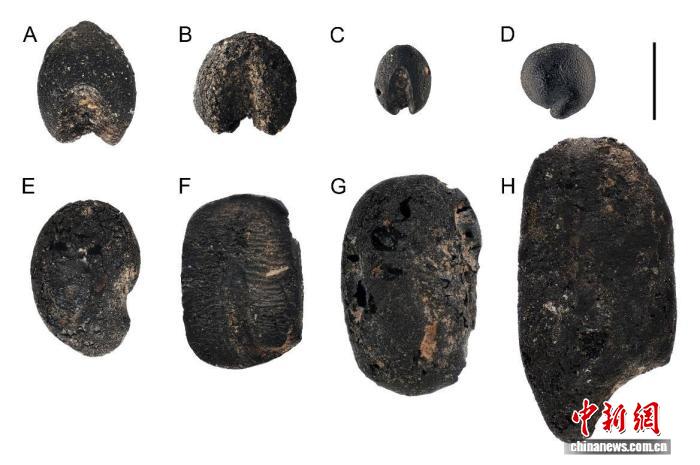 小高遗址出土的炭化植物种子(A)黍 (B)粟 (C)狗尾草 (D)藜(E)胡枝子 (F)小豆 (G)大豆 (H)水稻。受访者供图