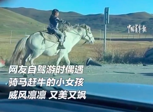 近日,四川阿坝,网友自驾游偶遇骑马赶牛的小女孩,威风凛凛,又美又飒。