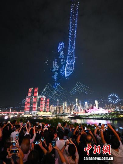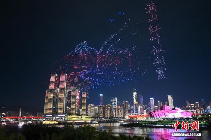 图为无人机在夜空勾勒出夔门与红叶相映的“壮美三峡”景观。中新社记者 何蓬磊 摄
